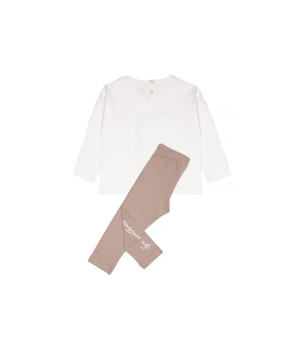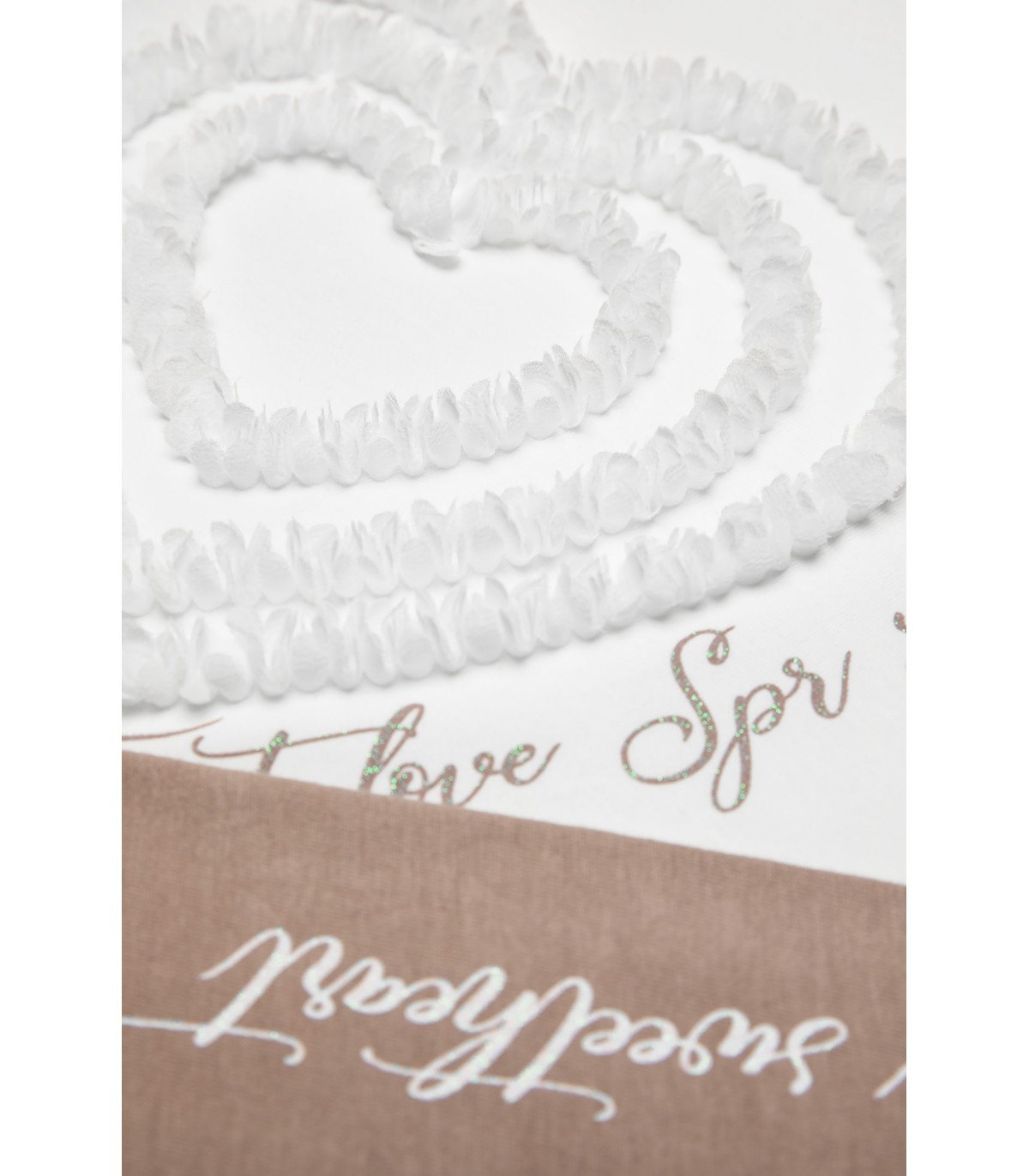 • Παιδικό σετ 2 τεμαχίων λύκρα. Μπλούζα με στρογγυλή λαιμόκοψη, κέντημα με ανάγλυφη υφή από γκοφρέ οργάντζα απλικέ που σχηματίζει καρδιά και τύπωμα με glitter γράμματα. Κολάν με τύπωμα glitter.