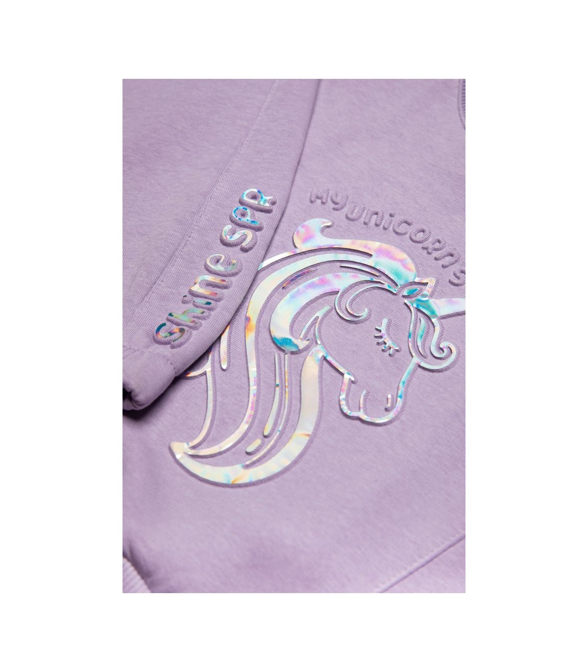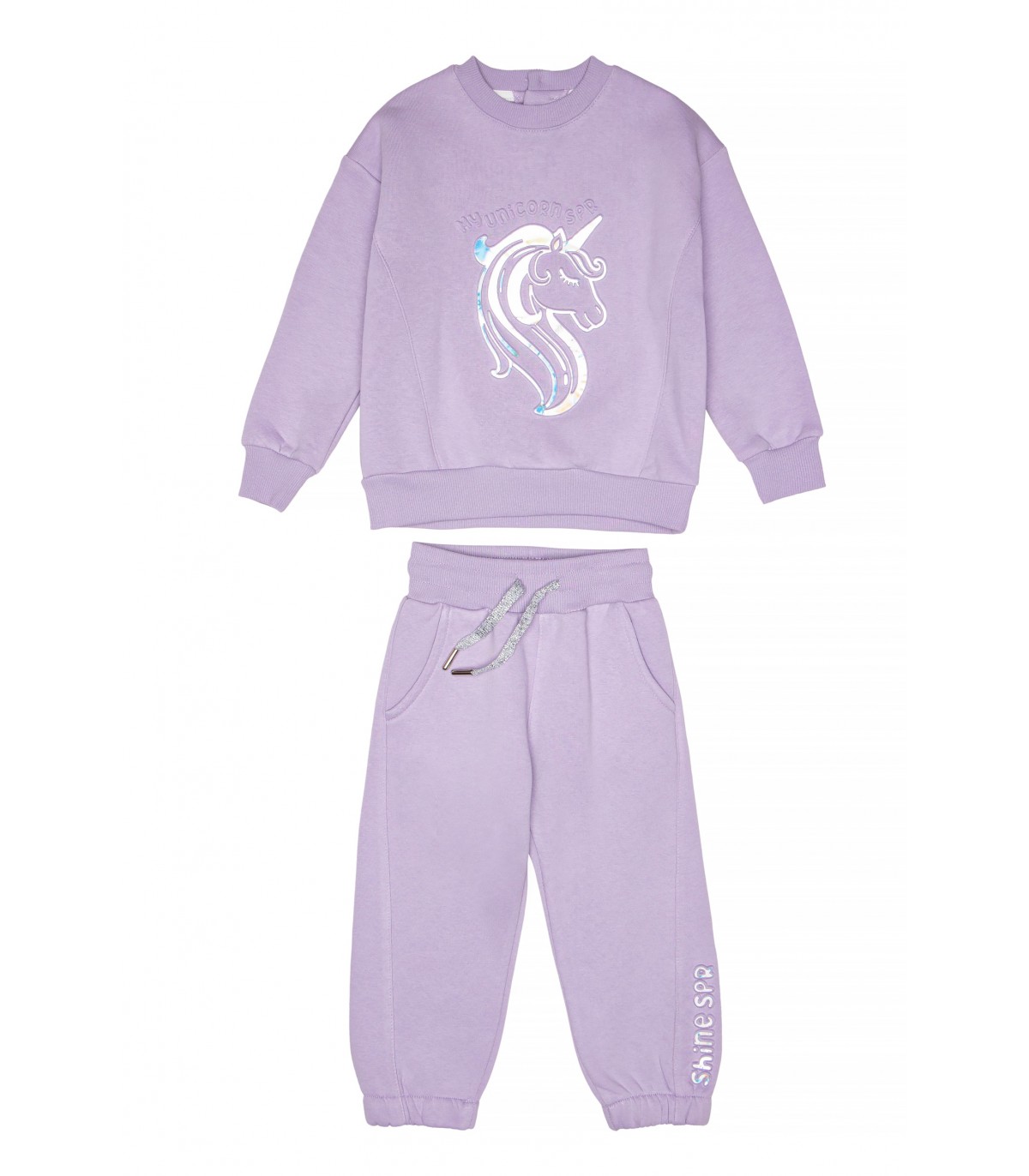 • Παιδικό σετ φόρμας 2 τεμαχίων φούτερ με χνούδι. Μπλούζα με στρογγυλή λαιμόκοψη, τύπωμα εμπρός ιριδίζον με ανάγλυφη υφή και θέμα UNICORN. Παντελόνι με ελαστικό ζωνάρι και ρυθμιζόμενα κορδόνια με μπροστινές λοξές τσέπες και ιριδίζον ανάγλυφο τύπωμα.