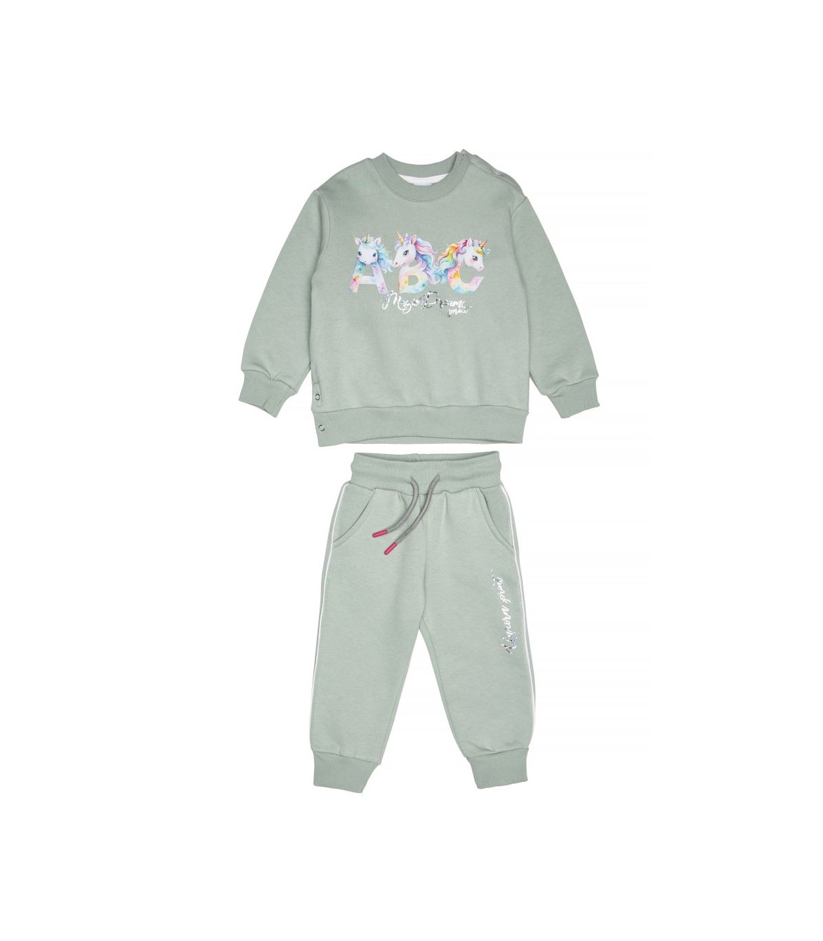 • Παιδικό σετ φόρμας 2 τεμαχίων φούτερ με χνούδι. Μπλούζα με στρογγυλή λαιμόκοψη και τύπωμα UNICORNS με ιριδίζον γράμματα και άνοιγμα με τρούκ στο πλάι. Παντελόνι με ελαστικό ζωνάρι και ρυθμιζόμενα κορδόνια με μπροστινές λοξές τσέπες, δίχρωμα ρέλια στο πλάι και ιριδίζον τύπωμα.