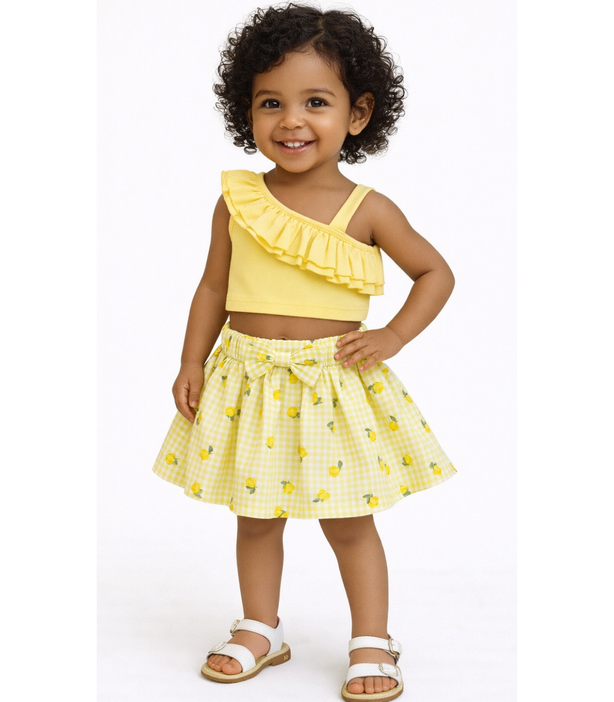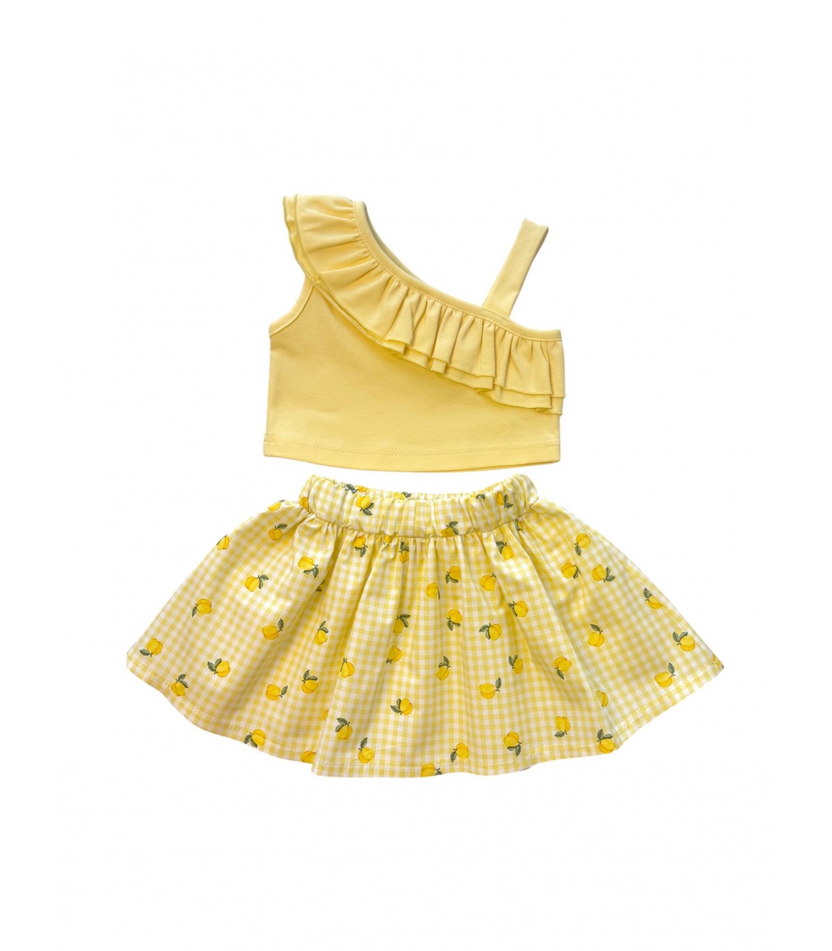 Σετ φούστα καρό με λεμόνια και μπλούζα με έναν ώμο και ράντα