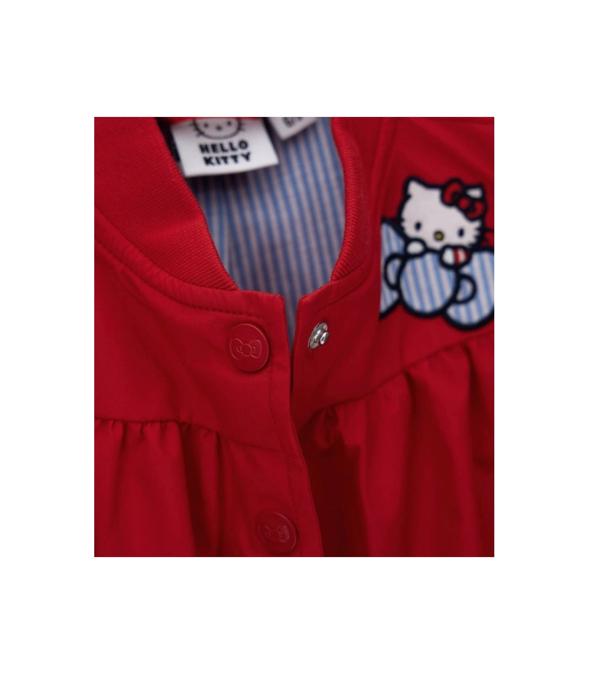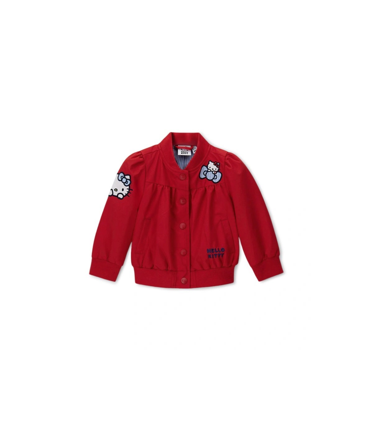 Κοριτσίστικο νάιλον bomber jacket Hello Kitty με μακρύ ριπ μανίκι για μέγιστη άνεση, διακοσμημένο με κεντήματα και απλικέ στο μπροστινό μέρος και στο μανίκι, άνοιγμα μπροστά με κουμπιά λογότυπου, μπροστινές τσέπες και εμπριμέ φόδρα για πρωτότυπες και στυλάτες εμφανίσεις.